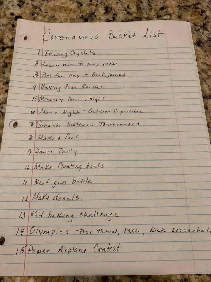 For those of you who don’t know our school district canceled all schools through April 6th to slow the progress of the Coronavirus. I’ve known this might happen and I’ve somewhat mentally prepared myself for it. As the week has progressed I’ve prayed about it a lot and like most things in my life I have looked for the silver lining. And the silver lining for me is that our life will slow down. No longer will my husband and I have to divide and conquer to get our 4 boys everywhere they need to be. For the next few weeks we will enjoy family dinners, we will enjoy the time together without anywhere to go. But in true Smith style we decided to make a Coronavirus Bucket List. So at dinner tonight we collected all of our must do ideas for the next few weeks. Not sure we will get through them all but we will definitely try!
