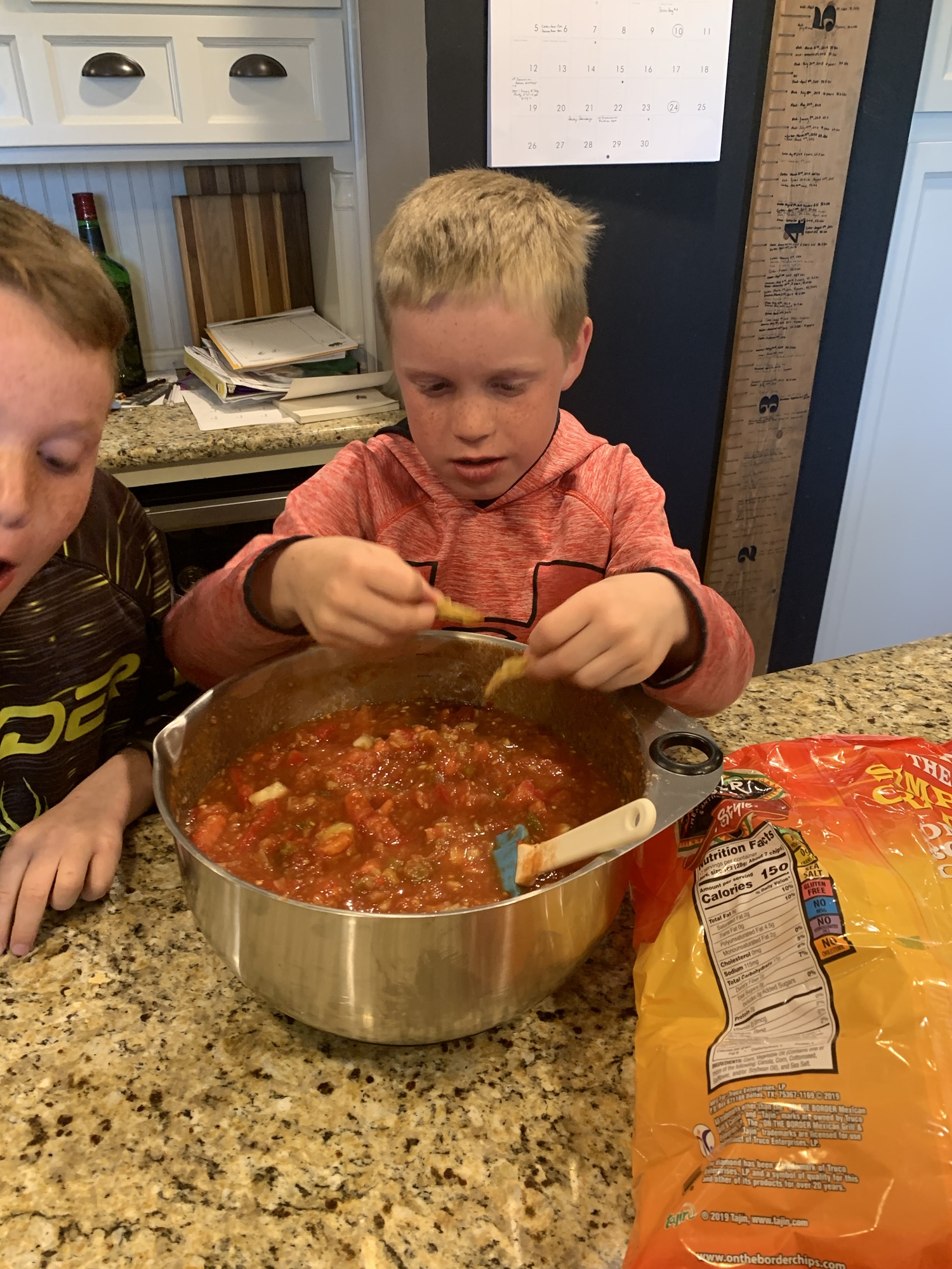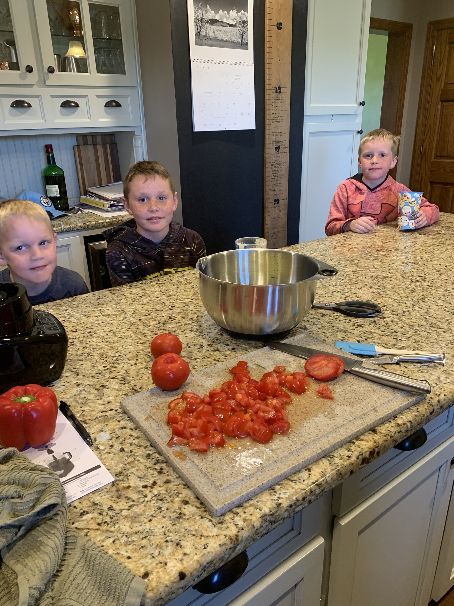 Kids headed outside for awhile and I then called them inside to make cucumber salsa. After my knuckle wounding by the hand grater Adam was nice enough to grab me a new chopper on one of his Walmart runs. I’ve made salsa with my mom a bunch when I was younger but it was the first time with my kids. Who would have thought pressing the on button and feeding vegetables into a processor would be so much fun for them but it was.