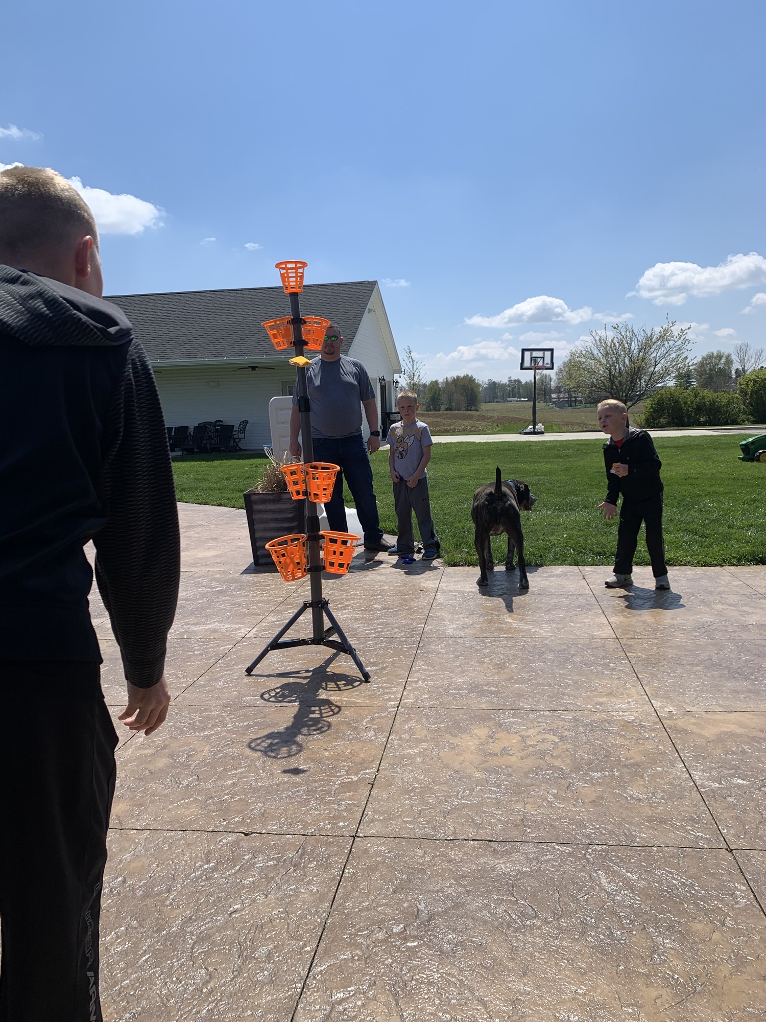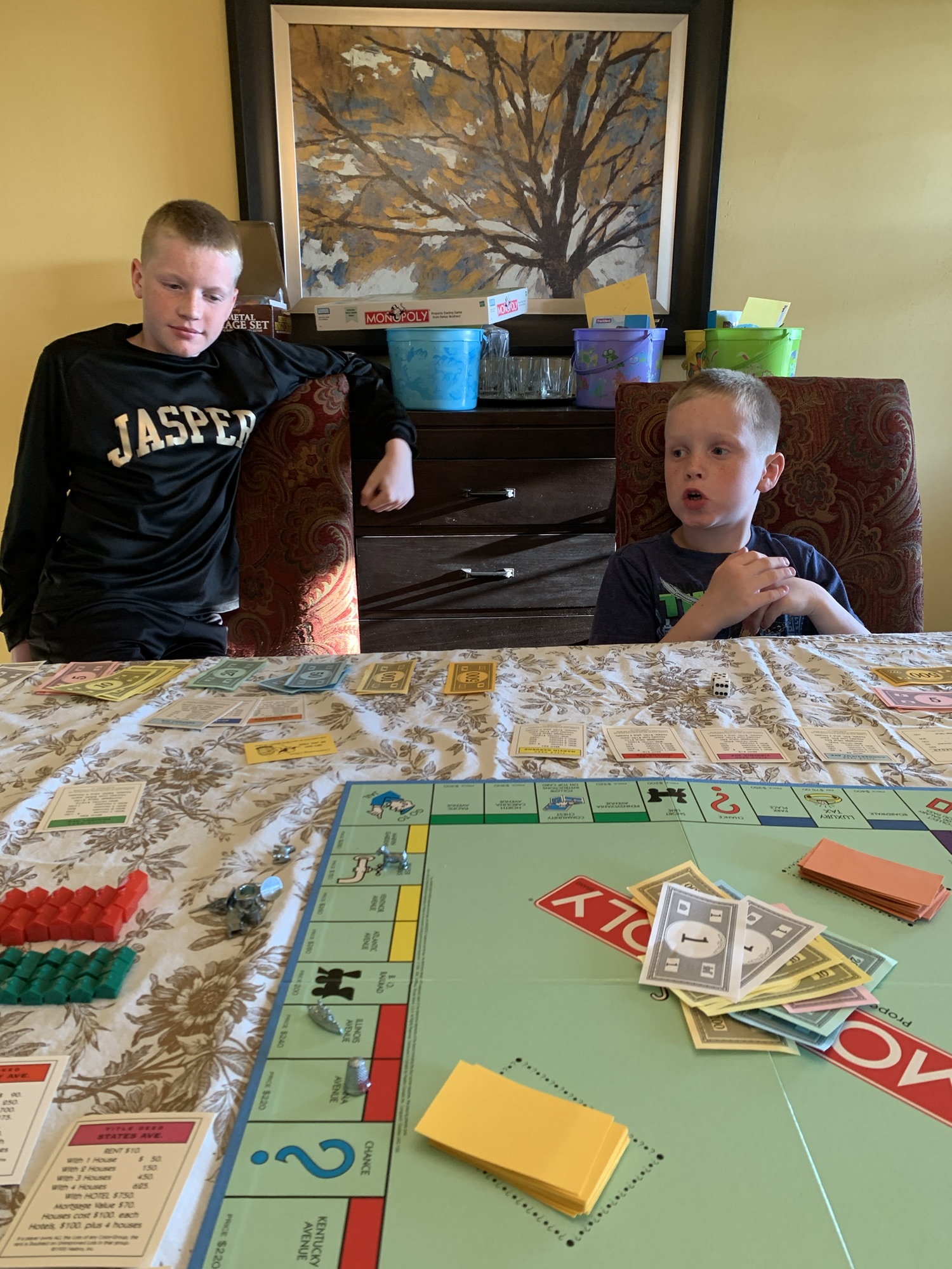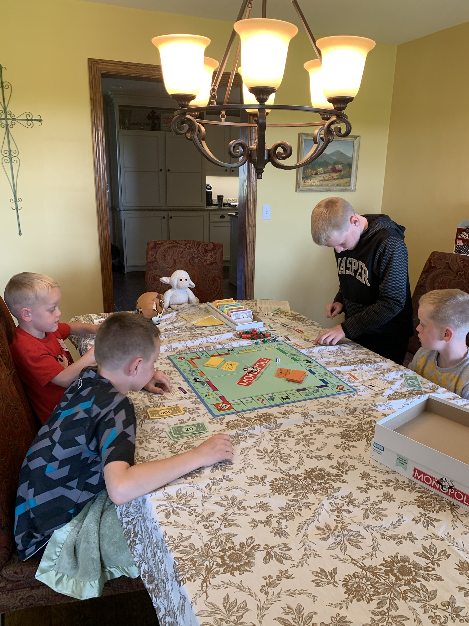 Spent most of the day outside playing with the kids new Easter games. Played quite a few rounds of Noah’s new bean bag game. Then Corbin and Noah played with the curve ball toss. Lots of bike riding, trampoline time and sunshine. By 4 o’clock the kids were toast and asked to go inside to relax. Adam said it was fine as long as they weren’t on the internet. No xbox, youtube, or Disney plus. They could watch tv or do something else. I went inside a little while later to find them playing the real monopoly. Everyone was set up and apparently Lambie and Snake were there to make sure no one cheated. Rarely if ever do they play a bored game just the 4 of them. It’s amazing what the kids will do when you reduce the options.