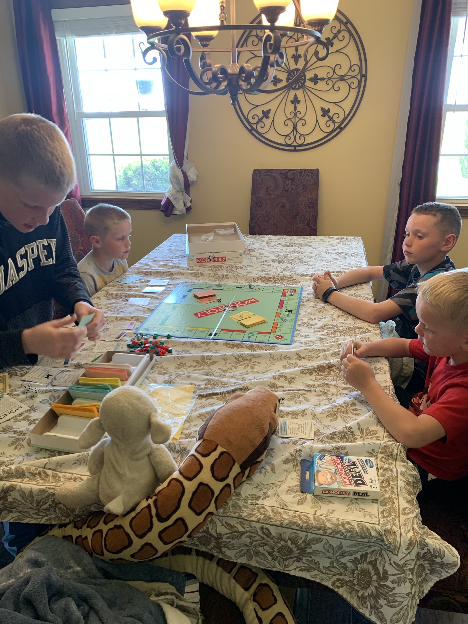 Cleaned up all the dishes and the boys and I sat down to play monopoly. I quickly realized that the game they had played earlier in the afternoon was not played by the rules. I asked Noah if he had referenced the rule book and his response was “there is a rule book?” We played for a little over an hour and all properties had been bought. We had to quit but I promised to play again with them on a rainy day until we have an official winner. What I learned is that my younger boys are starting to try to trash talk each other and they are absolutely terrible. When someone did something Owen didn’t like he would yell “you cheesy cheeks!!” Um what? Dawson, likes to yell gibberish as loud as he can. Corbin keeps pretty quiet but Noah has started to up his sighing game. At 12 he’s not a professional yet but he isn’t in the farm league anymore either.
